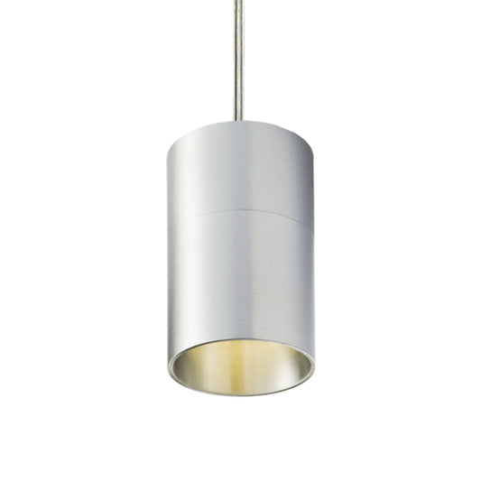 Minimalistische cilindrsiche hanglamp voor GU10 lichtbronnen op ronde basis. Ingebouwde veren in de fitting maken het gebruik van lichtbronnen van verschillende lengtes mogelijk.