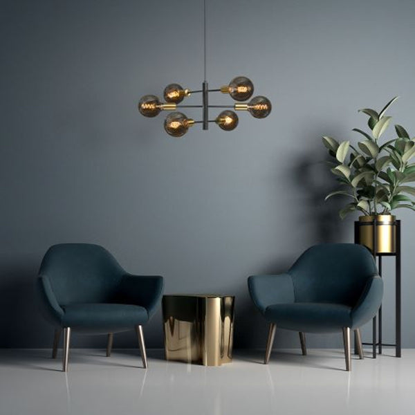 Design hanglamp met decoratieve messing fittingkappen. De armatuur kan gevormd worden door de armen langs de horizontale as aan te passen. Geschikt voor LED lichtbronnen met een E27 fitting.