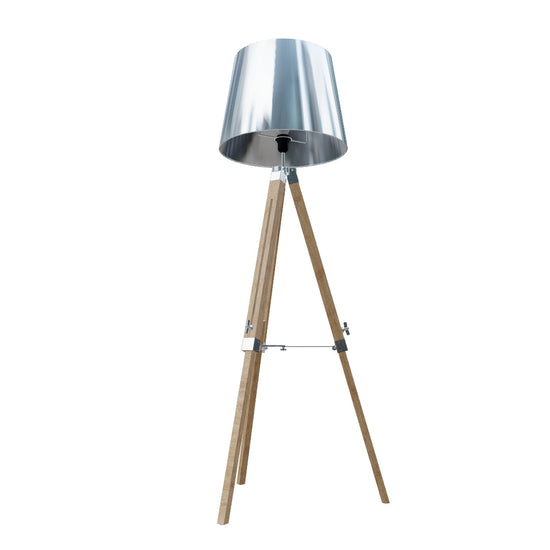 Een vloerlamp met een kap van chroomfolie. Heeft een in hoogte verstelbare bamboe basis. Geschikt voor LED E27 lichtbronnen.