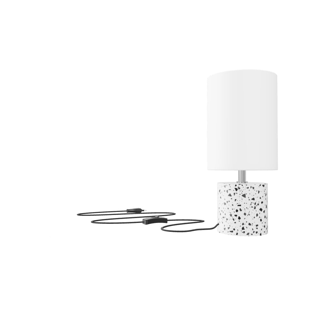 Minimlistische cilindrische tafellamp met textiel lampenkap. Elk product heeft een origineel patroon.