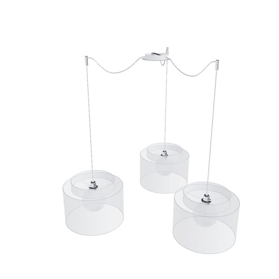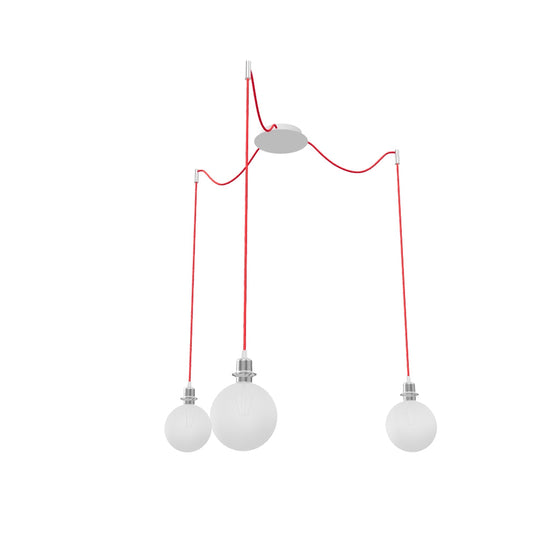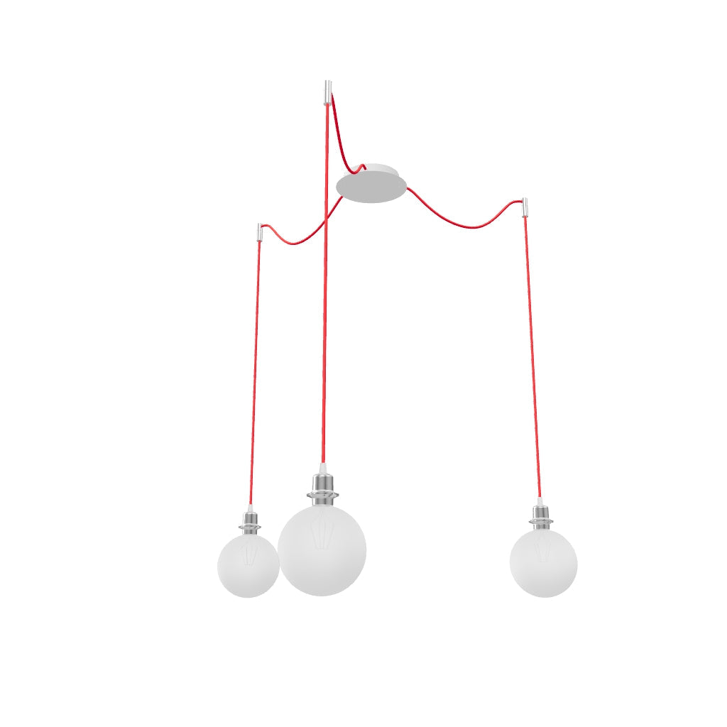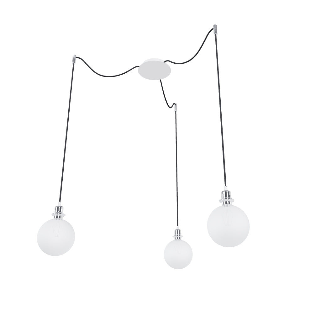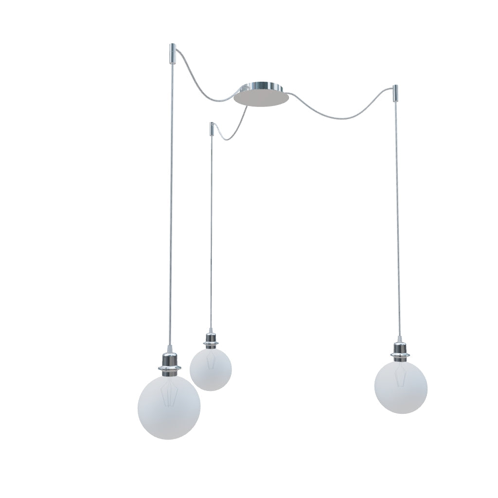 Hanglamp met gecentraliseerde plafondbasis en individuele textiel kabels met metalen E27 lamphouders, voor gebruik met decoratieve lampen of geschikte textiel lampenkappen. De kabels zijn aan het plafond bevestigd met afzonderlijke, verstelbare chroomgrepen. De kabels zijn 3 meter lang. Geschikte lampenkappen: ARISTA, DELI, JAKARANDA, DOUBLE 40/30, DOUBLE 55/30, ASPRO 40/30, ASPRO 55/30, RON 15/20, RON 40/25, RON 55/30, TEMPO 15/30, TEMPO 30/19.