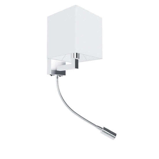 Wandlamp met textiel lampenkap en LED op zwanenhals. De twee lichtbronnen kunnen individueel worden geschakeld door schakelaars die zich op de basis bevinden.