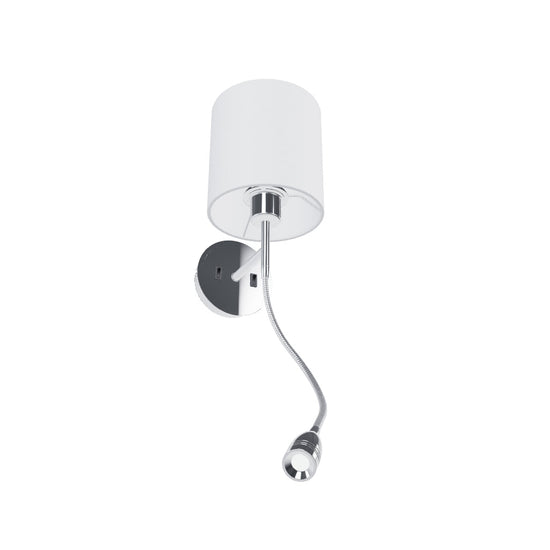 Wandlamp met textiel lampenkap en LED op zwanenhals. De twee lichtbronnen kunnen individueel worden geschakeld door schakelaars die zich op de basis bevinden.